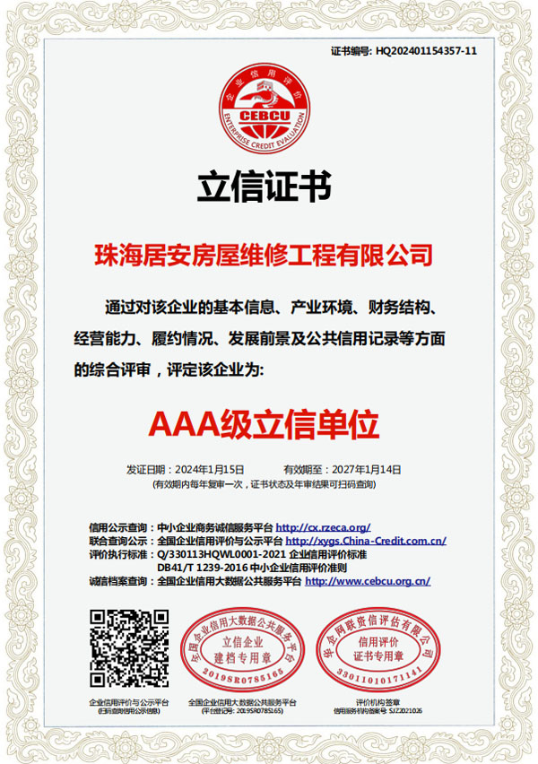珠海居安房屋維修工程有限公司成立于2020年,是一家專注房屋維修的公司。我們擁有各類型專業(yè)人才,業(yè)務包括老舊建筑翻新改造、外墻空鼓修復、防水幕墻養(yǎng)護、外墻預置構件拆除更換、供排水管網(wǎng)改造、墻面翻新、鋼制結(jié)構建筑構建及折除,外墻清洗及裝修裝飾。 公司自成立以來,始終堅持以人為本、誠信敬業(yè)的經(jīng)營原則,與多家單位達成固定維修、養(yǎng)護清洗協(xié)儀,業(yè)務遍及廣州、東莞、中山、珠海等多個周邊城市。專業(yè)化團隊尤其在墻面及窗邊防水工程業(yè)內(nèi)知名。…… >>> 更多內(nèi)容 |